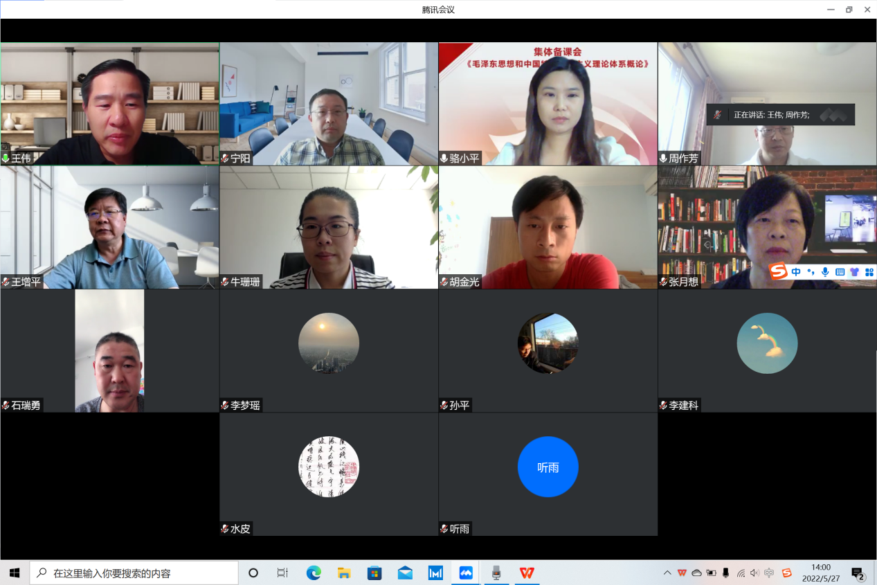 为进一步提升思政课教师教科研能力和水平,促进思政课的科学性和学理性,全面提升思政课教学质量,5月27日,《毛泽东思想和中国特色社会主义理论体系概论》课教研室通过线上平台召开集体备课会,学校副校长王增平出席备课会并讲话。Beat365官方网站领导班子成员,概论课教研室全体教师及研究生代表参加,备课会由王伟主持。