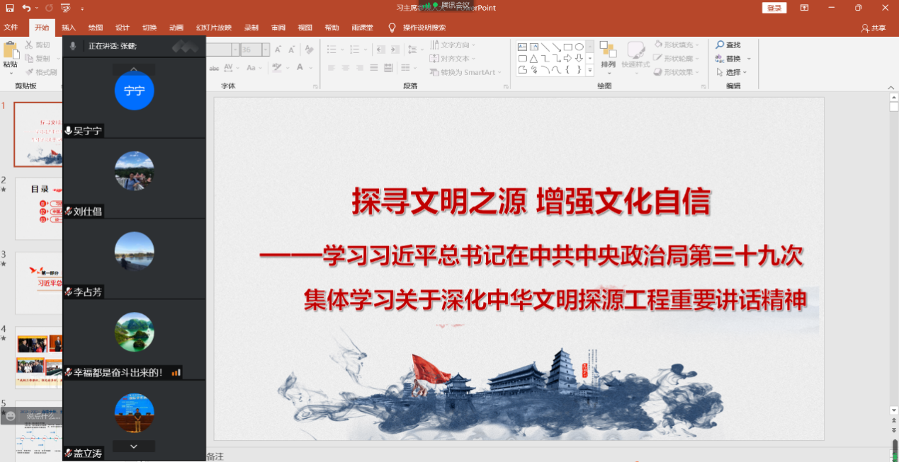 6月22日下午,Beat365官方网站原理与思修党支部与外国语学院英语专业党支部、核科学与工程学院核工程第二教研室党支部、控制与计算机工程学院机器人与智能系统党支部、经济与管理学院物流师生联合党支部开展联学共建,“深入学习习近平总书记在中共中央政治局第三十九次集体学习关于深化中华文明探源工程重要讲话精神”主题党日活动,本次学习共有44名老师参加,由我院原理与思修党支部书记吴宁宁主持。