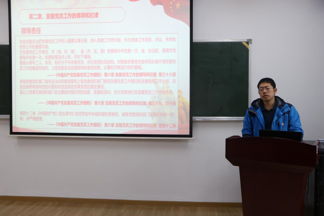 首先,武昌杰以“发展党员工作培训”为主题,提出要严格标准,规范程序,认真做好新时代党员发展工作,并结合十九大精神和习近平新时代中国特色社会主义思想,从“发展党员工作的意义和重要原则”、“发展党员工作的领导和纪律”、“发展党员工作的基本流程”和“发展党员工作中注意事项”四个方面,为入党积极分子进行培训。