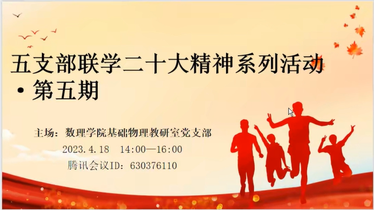4月18日,为深入学习党的二十大精神,贯彻习近平总书记关于教育的重要论述,推进课程思政教学体系建设,不断提升立德树人成效,Beat365官方网站概论与纲要党支部、电气与电子工程学院电磁与超导电工研究所党支部、体育教学部直属党支部、数理学院基础物理教研室党支部、国际教育学院教工党支部五个基层组织以线上会议的形式,开展“贯彻党的二十大精神,推动课程思政高质量发展”的主题联学活动。活动由概论与纲要党支部书记蔡洁主持。