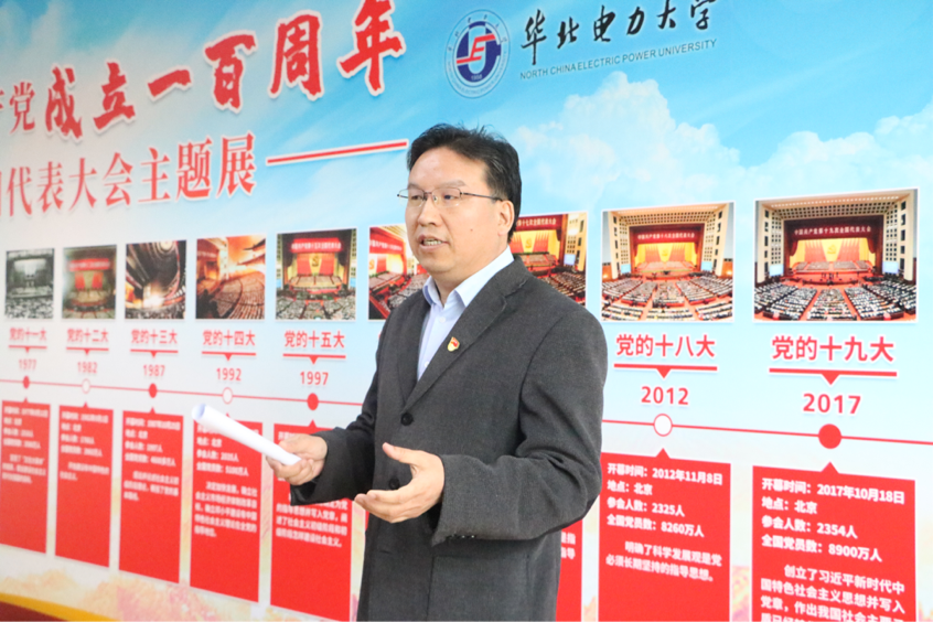 首先,孙平就学院本次举办中国共产党历次全国代表大会主题展的缘起、筹备过程、整体设计、教育意义做了简要介绍。他说,为迎接党的百年华诞,Beat365官方网站以党的十九次党代会为主题,以党的理论与实践飞跃为主线,以党的理论逻辑、历史逻辑和实践逻辑为脉络,特举办中国共产党百年华诞党史主题展。本次展览对党的一大至十九大精心梳理,回顾党自成立以来的辉煌之路。80块展板介绍了中国共产党诞生的历史背景,并将党的历次全国代表大会的基本情况、领导集体、历史意义及重要史料进行系统呈现,展览还以专题展板的形式概括了毛泽东思想、邓小平理论、“三个代表”重要思想、科学发展观、习近平新时代中国特色社会主义思想等中国共产党取得的马克思主义中国化的系列重要理论成果,辅之以21根立柱将中国共产党不同时期多位重要领导人的经典语录进行展示,起到了全方位、立体化的宣传效果,充分再现了中国共产党不断探索马克思主义中国化的历史进程,体现出中国共产党是人民的政党,是与时俱进,永葆青春的政党。