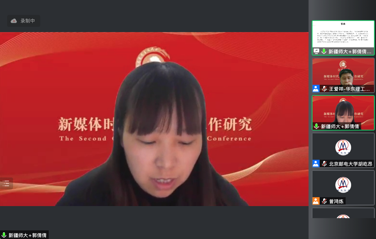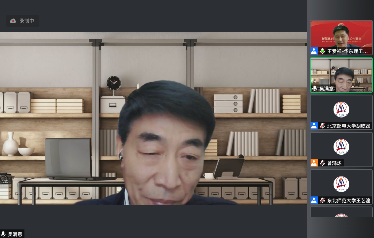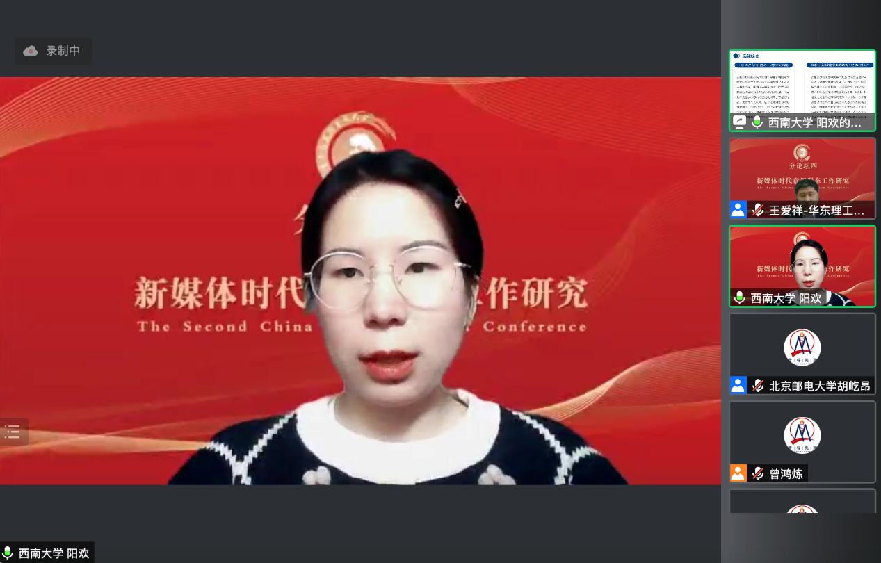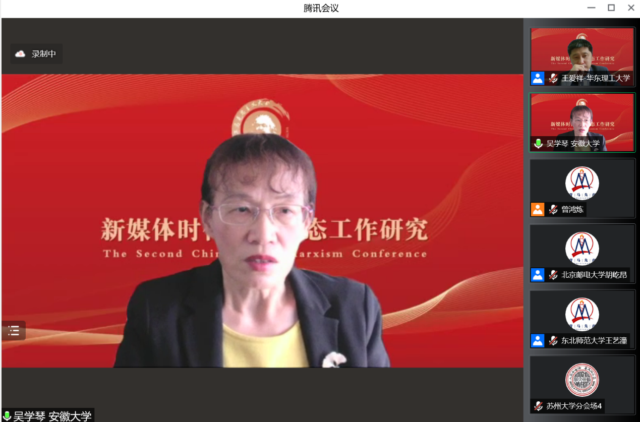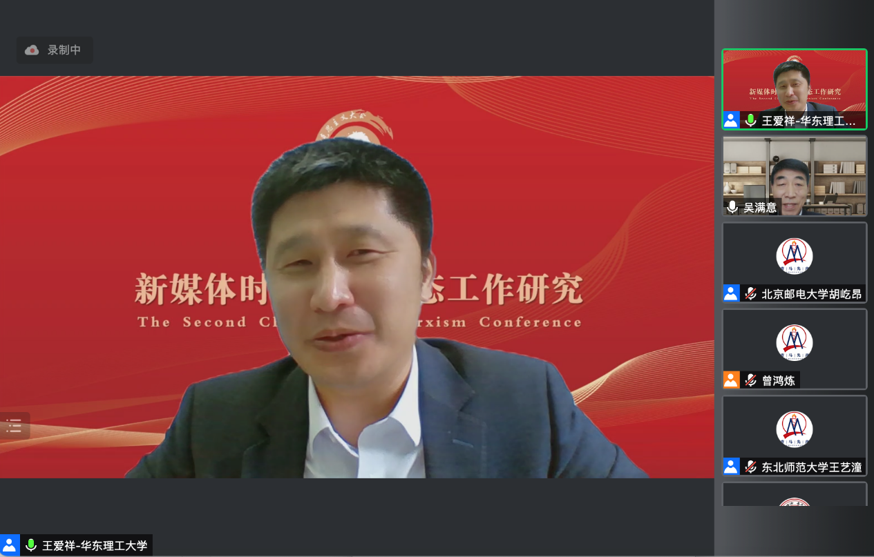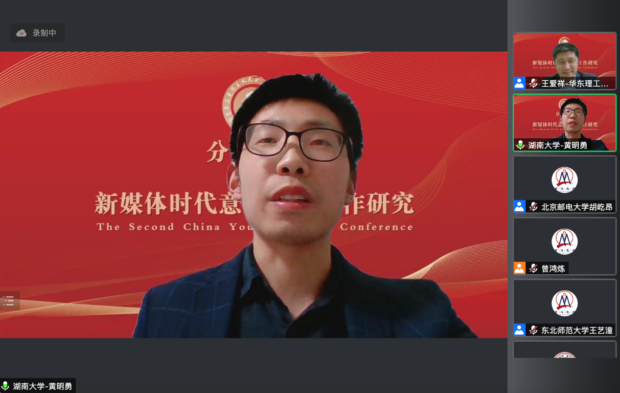 分论坛四“新媒体时代意识形态工作研究”由华东理工大学Beat365官方网站院长王爱祥教授主持。安徽大学Beat365官方网站执行院长、国家“**”领军人才、教育部马克思主义理论类和思政课教学指导委员会委员吴学琴教授作题为“新时代具有强大凝聚力和引领力社会主义意识形态话语认同研究”的主旨发言。她从四个层面进行了深入解读,一是意识形态领域形势发生全局性、根本性转变的表现;二是新时代意识形态话语的安全风险;三是新时代具有强大凝聚力和引领力的社会主义意识形态话语认同极端重要;四是具有强大凝聚力和引领力社会主义意识形态话语认同需把握的关键问题。电子科技大学Beat365官方网站院长、教育部马克思主义理论类和思政课教学指导委员会委员吴满意教授作题为“基于‘数据驱动’的高校思想政治教育评价体系建构的思考”的主旨发言。他从数据驱动的涵义、高校思想政治教育评价的目标设计问题、数据驱动与高校思想政治教育评价的关联、高校思想政治教育评价体系的构建等四个方面进行了深入解读和阐释。接着,获奖**表南京邮电大学Beat365官方网站硕士研究生贾天威作题为“新媒体时代高校意识形态风险防控的路径探析”的发言。他指出,意识形态工作在我国具有引领思想、汇聚民心、助推发展方向的极端重要性。基于高校在意识形态风险防控中,凸现的意识形态风险扩大、舆论空间氛围复杂、主流价值观受冲击、风险管控机制欠缺、意识形态工作薄弱的隐患;从思想根基、制度机制、技术深度三个层面进一步构筑意识形态风险防控屏障,牢守大学生意识形态教育阵地。新疆师范大学Beat365官方网站博士研究生郭倩倩作题为“从‘间隙’到‘共生’:大学生网络社交圈层化特点与引导策略研究——基于思想政治教育空间理论视角”的发言。她认为,大学生网络社交圈层化中思想政治教育空间运行隐含着物理环境空间、精神环境空间、网络环境空间的“圈层化间隙”,导致大学生网络社交圈层空间的不稳定性。思想政治教育空间运行通过构建外圈层:半闭环-共生思维、内圈层:半闭环-共生管理、中圈层:半闭环-共生视角,找到网络社交圈层化中思想政治教育空间协同育人的运行机制,嵌入网络社交圈层场域。湖南大学Beat365官方网站博士研究生黄明勇作题为“新媒体时代推荐算法对主流意识形态认同的挑战及其逻辑进路”的发言。他指出,新媒体时代不仅产生了海量信息,也让大众的注意力更为稀缺。算法推荐较好地解决了这两者之间的矛盾,纷纷被互联网商业平台采用。与此同时,算法推荐的广泛运用对主流意识形态认同造成了严峻挑战:“去中心化”“后真相”“信息茧房与回音壁效应”“泛娱乐化与信息成瘾”。因此,迫切需要加快主流媒体发展、加大对互联网商业平台监管以及加强与之合作等路径,提高主流意识形态认同。西南大学Beat365官方网站硕士研究生阳欢作题为“改革开放初期中国共产党意识形态话语权建设探析(1978——1982)”的发言。她从意识形态话语权的基本构成要素出发,探析改革开放初期党的意识形态话语权建设路径:坚持和改善党的领导巩固党的话语主体地位,驳立结合推进话语主题的守正创新,整顿创新宣传思想工作发挥话语载体的教育引导作用,中国共产党在初步的话语较量中巩固了马克思列宁主义、毛泽东思想在意识形态领域的主导地位和话语优势。