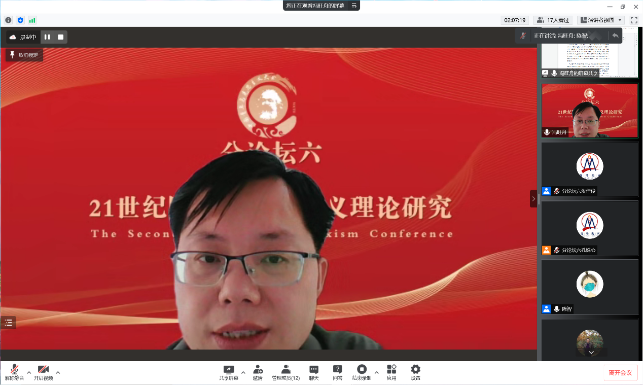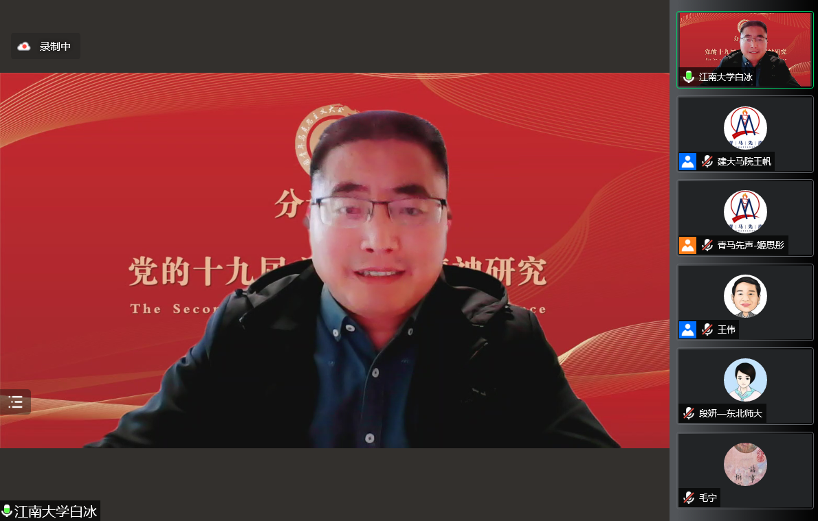 第四阶段的主旨发言由东北大学Beat365官方网站院长、教育部**特聘教授田鹏颖主持。吉林大学党委副书记、教育部**特聘教授韩喜平作题为“自由主义时代的结束与思想变革”的主旨发言。他从自由主义的形成及其特征、自由主义的能量及其力量来源、自由主义的反复及其危害、自由主义的批判及新的理论需求等五个方面进行了深入解读。他强调,自由主义是西方近现代哲学社会科学体系的思想基础,自由主义的基本观念是西方主流的理论前提和价值原则。自由主义正是通过在理论前提和价值原则层面的基础地位从西方哲学社会科学的生成、发展和对外扩张上持续施以强大影响力的。但随着时间的推移,诸多迹象表明发展的时和势在向以马克思主义理论指导的东方转向,自由主义时代的结束和新的思想时代的到来。他指出,立足世界百年未有之大变局,自由主义固有的问题已成为阻碍世界发展和人类进步的观念障碍,其个体性和竞争性的隐蔽前提需要通过新的哲学社会科学体系来消弭,破解当今世界难题,推动世界发展。教育部**特聘教授、国务院第八届马克思主义理论学科评议组成员、南京师范大学Beat365官方网站王永贵教授作题为“以历史主动精神建设具有强大凝聚力和引领力的意识形态”的主旨报告。他指出要从历史、现实、未来三方面深刻认识历史主动精神,这一理解和审视新时代意识形态领域形势转变的重要密码,要准确把握意识形态的战略定位问题。他认为提升意识形态凝聚力和引领力的整体效果,一是在于处理好理论实践的关系;二是定位创新和制度建构;三是要积极构建中国话语和中国叙事的体系。教育部**特聘教授、江苏省马克思主义理论研究会会长、南京大学Beat365官方网站院长胡大平教授作题为“中国共产党百年来理论和实践创新的经验”的主旨发言。他从党的百年理论和实践创新切入,以毛泽东创作《新民主主义论》为具体实例,启示青年学生在创新过程中要坚守宗旨、不忘初心,要把党的建设的经验运用于自身,坚持“两个结合”,坚持依靠人民,尊重人民的首创精神,深入社会历史进程,对具体的社会历史问题进行分析研究。苏州大学马克思主义研究院副院长方世南教授作题为“人类命运共同体视野内的生态安全与生命安全”的主旨发言。他从席卷全球的新冠肺炎疫情出发,指出构建人类命运共同体对确保生态和生命安全的重大价值。他认为人类命运共同体理念揭示了生态安全与生命安全的辩证统一性。最后,他提出了人类命运共同体视野内确保生态安全和生命安全的四个路径选择。