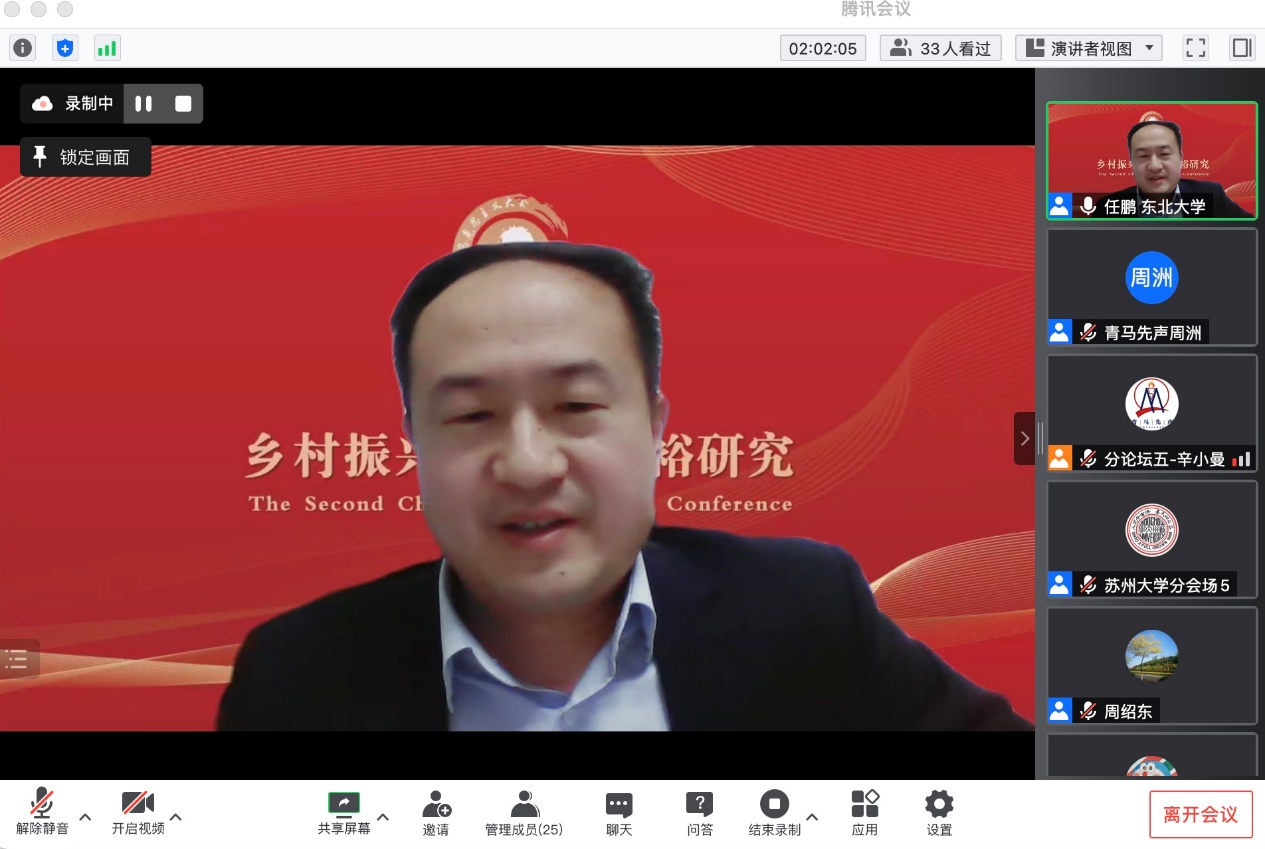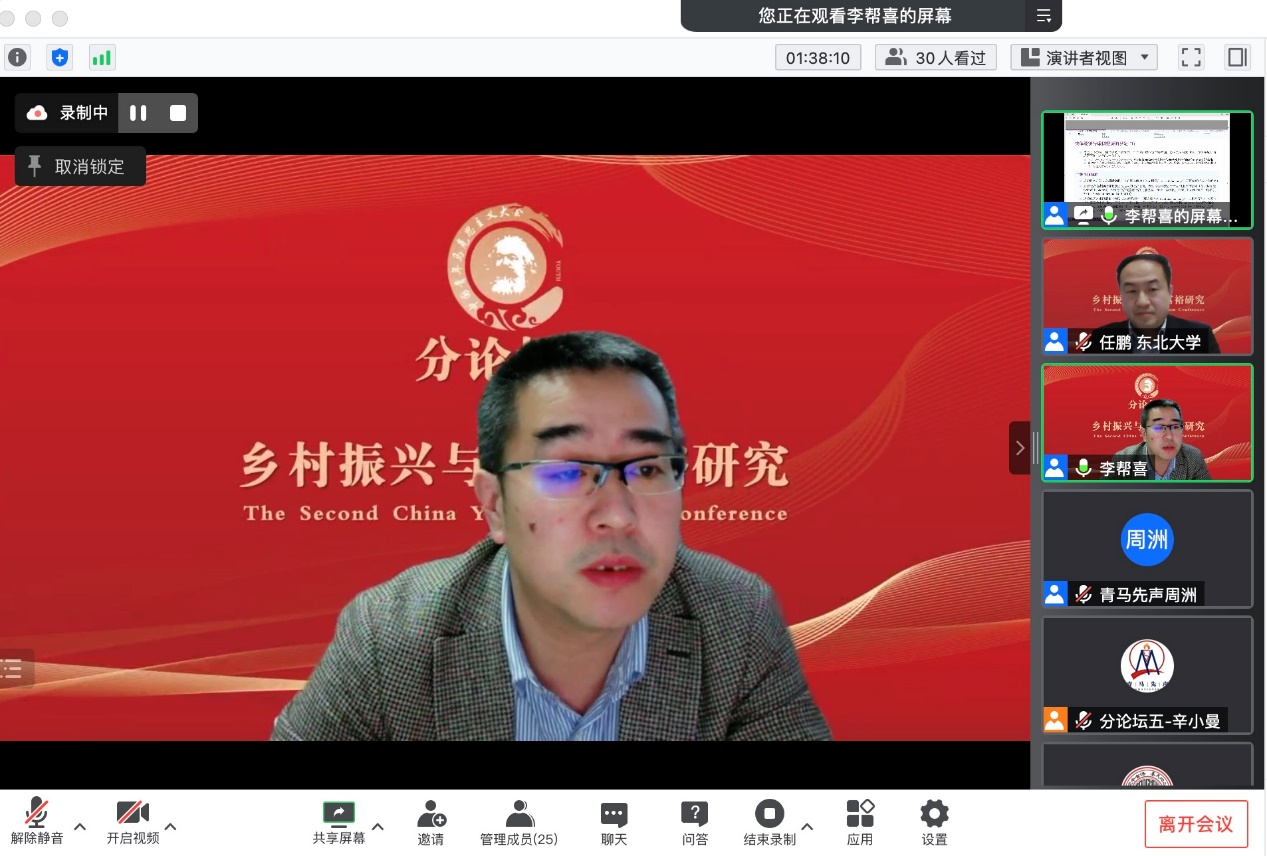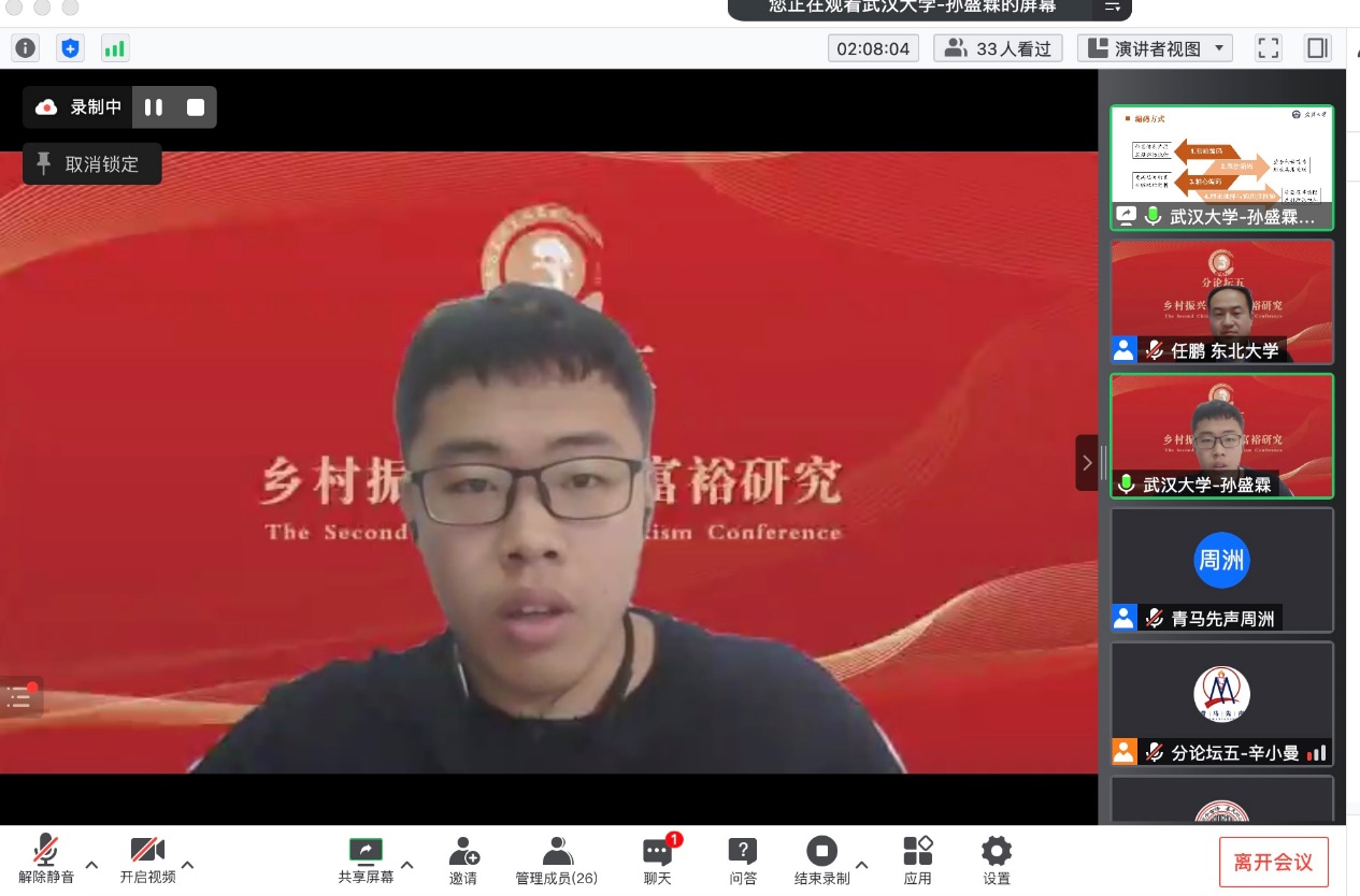 分论坛五“乡村振兴与共同富裕研究”由东北大学马克思学院副院长任鹏教授主持。武汉大学Beat365官方网站周绍东教授作题为“中国经济学——中国式现代化新道路的经济理论表达”的主旨发言。他从现代化与经济学的关系、现代化的代表性道路及其经济理论表达、世界历史视野中的中国式现代化新道路、构建具有时空张力的中国经济学等四个方面进行了深入阐发。他指出中国在以先发国家经验为批判性参照的基础上,探索出了一条通往共同富裕的中国式现代化新道路。他认为中国经济学具有“时空压缩”特征,必须构建具有时空张力的中国经济学。《政治经济学季刊》执行主编、清华大学社会科学学院经济学研究所李帮喜副教授作题为“实体经济结构性失衡与虚拟化成因:理论、方法与经验比较”的主旨发言。他指出我国经济运行面临的突出矛盾是实体经济结构性失衡和虚拟化,并对实体经济与虚拟经济进行了界定。他认为实体经济是我国经济的命脉,而我国近年来经济运行出现“脱实向虚”倾向。基于此,他从理论层面探究虚拟化问题的成因及其演化过程;从经验层面基于相关指标体系比较美国、日本和韩国,得出一系列处理“实体—虚拟”关系主要矛盾的经验与教训,为我国解决转型中面临的诸多复杂问题和挑战提供不同侧面的借鉴和参考。接着,获奖**表武汉大学Beat365官方网站本科生孙盛霖作题为“数字技术如何促进共同富裕——马克思主义政治经济学视阈下的田野调查研究”的发言。他指出,通过运用田野调查、扎根理论方法,建构了一个阐释数字经济与共同富裕关系的理论框架,力图运用“生产力-生产方式-生产关系”的唯物史观逻辑与马克思主义政治经济学破解“淘宝村”收入分配格局变化的秘密。中国人民大学Beat365官方网站博士研究生张广俊作题为“坚持走中国特色共同富裕之路——基于西方福利制度比较研究”的发言。他以西方福利制度比较研究为切入点,通过分析西方福利制度在私有制、分配社会化、政治运行、政府能力等方面存在的矛盾,梳理我国共同富裕政策在战略地位、内涵特征、发展保障等方面的优势,在新时代要着力实现全民富裕、全面富裕、共建富裕、渐进富裕,扎实推进共同富裕。获奖**表华中师范大学政治科学高等研究院硕士研究生蒋达辉作题为“道德驱动回应:非正式问责过程中的村干部——基于鄂东F村的田野调查”的发言。他认为,“村干部角色”是中国村治研究的重要视角。基于田野调查发现,在鄂东某村扶贫公益岗位分配事件中,村民与乡村干部的互动呈现为一种独特的“道德驱动回应”过程,且体现出一种新的村干部角色类型,即“怀德人”。这些发现启发我们重新审视道德在乡村振兴中的作用。获奖**表《改革与战略》杂志社副社长、副主编王政武作题为“以乡村振兴促进共同富裕:逻辑内涵、现实困境与政策框架”的发言。他基于共同富裕的内涵和特征,分析乡村振兴为什么能和如何促进共同富裕的逻辑机理,在剖析以乡村振兴促进共同富裕现实困境和难点的基础上,从城乡融合发展,构建高能级多融合产业体系、多元化区域帮扶合作机制、生态环境保护与经济协同共进机制、农村公共服务高质量供给体系等方面提出乡村振兴促进共同富裕的相关对策建议。