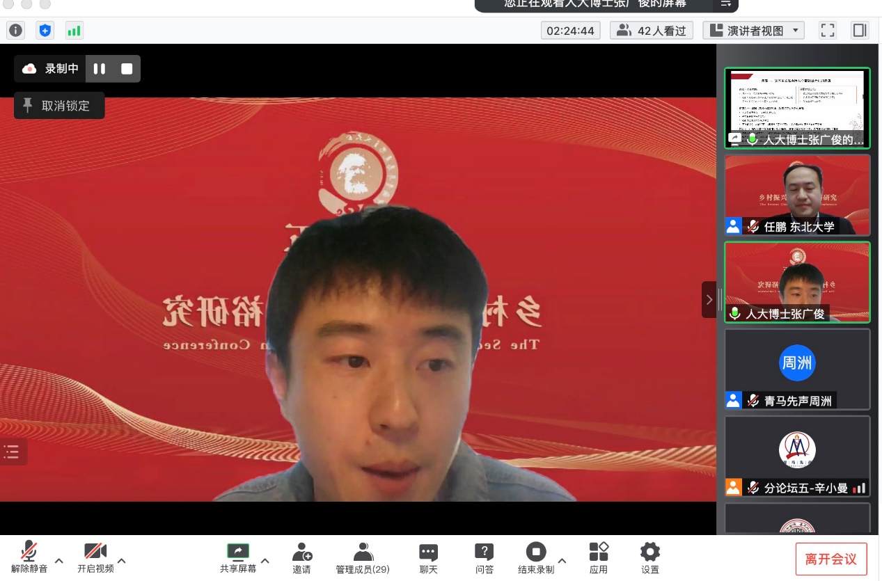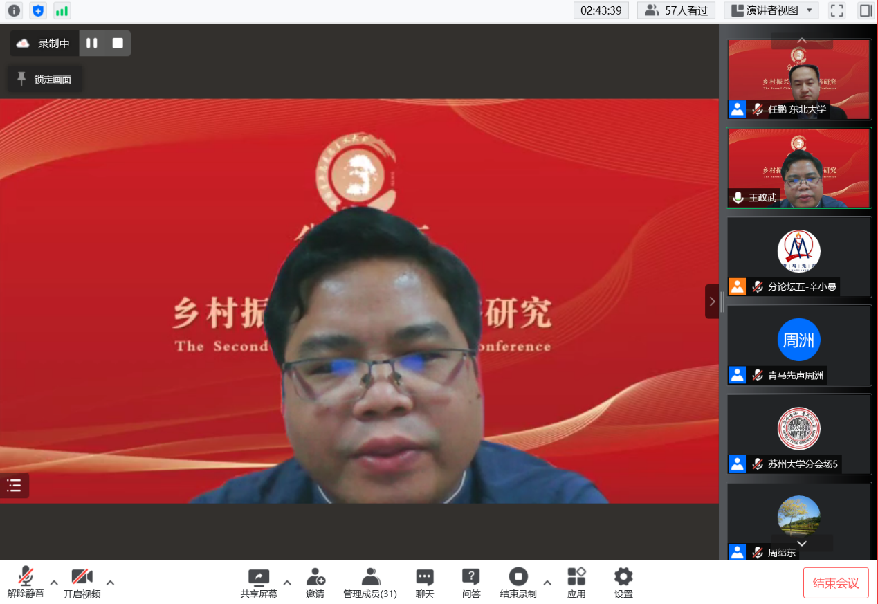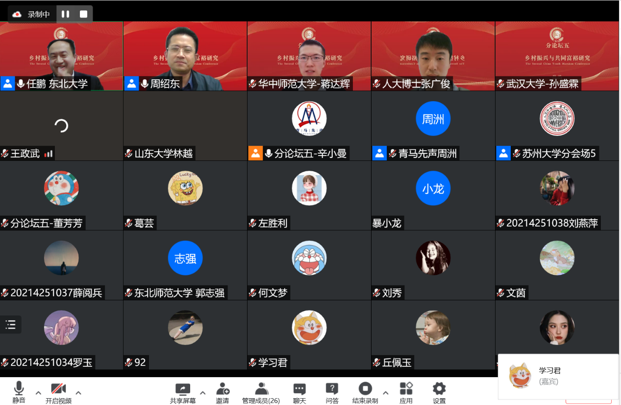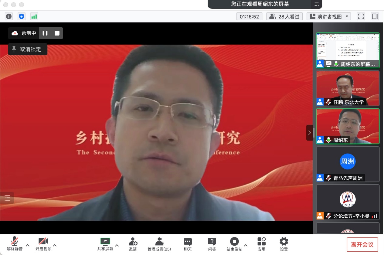 分论坛五“乡村振兴与共同富裕研究”由东北大学马克思学院副院长任鹏教授主持。武汉大学Beat365官方网站周绍东教授作题为“中国经济学——中国式现代化新道路的经济理论表达”的主旨发言。他从现代化与经济学的关系、现代化的代表性道路及其经济理论表达、世界历史视野中的中国式现代化新道路、构建具有时空张力的中国经济学等四个方面进行了深入阐发。他指出中国在以先发国家经验为批判性参照的基础上,探索出了一条通往共同富裕的中国式现代化新道路。他认为中国经济学具有“时空压缩”特征,必须构建具有时空张力的中国经济学。《政治经济学季刊》执行主编、清华大学社会科学学院经济学研究所李帮喜副教授作题为“实体经济结构性失衡与虚拟化成因:理论、方法与经验比较”的主旨发言。他指出我国经济运行面临的突出矛盾是实体经济结构性失衡和虚拟化,并对实体经济与虚拟经济进行了界定。他认为实体经济是我国经济的命脉,而我国近年来经济运行出现“脱实向虚”倾向。基于此,他从理论层面探究虚拟化问题的成因及其演化过程;从经验层面基于相关指标体系比较美国、日本和韩国,得出一系列处理“实体—虚拟”关系主要矛盾的经验与教训,为我国解决转型中面临的诸多复杂问题和挑战提供不同侧面的借鉴和参考。接着,获奖**表武汉大学Beat365官方网站本科生孙盛霖作题为“数字技术如何促进共同富裕——马克思主义政治经济学视阈下的田野调查研究”的发言。他指出,通过运用田野调查、扎根理论方法,建构了一个阐释数字经济与共同富裕关系的理论框架,力图运用“生产力-生产方式-生产关系”的唯物史观逻辑与马克思主义政治经济学破解“淘宝村”收入分配格局变化的秘密。中国人民大学Beat365官方网站博士研究生张广俊作题为“坚持走中国特色共同富裕之路——基于西方福利制度比较研究”的发言。他以西方福利制度比较研究为切入点,通过分析西方福利制度在私有制、分配社会化、政治运行、政府能力等方面存在的矛盾,梳理我国共同富裕政策在战略地位、内涵特征、发展保障等方面的优势,在新时代要着力实现全民富裕、全面富裕、共建富裕、渐进富裕,扎实推进共同富裕。获奖**表华中师范大学政治科学高等研究院硕士研究生蒋达辉作题为“道德驱动回应:非正式问责过程中的村干部——基于鄂东F村的田野调查”的发言。他认为,“村干部角色”是中国村治研究的重要视角。基于田野调查发现,在鄂东某村扶贫公益岗位分配事件中,村民与乡村干部的互动呈现为一种独特的“道德驱动回应”过程,且体现出一种新的村干部角色类型,即“怀德人”。这些发现启发我们重新审视道德在乡村振兴中的作用。获奖**表《改革与战略》杂志社副社长、副主编王政武作题为“以乡村振兴促进共同富裕:逻辑内涵、现实困境与政策框架”的发言。他基于共同富裕的内涵和特征,分析乡村振兴为什么能和如何促进共同富裕的逻辑机理,在剖析以乡村振兴促进共同富裕现实困境和难点的基础上,从城乡融合发展,构建高能级多融合产业体系、多元化区域帮扶合作机制、生态环境保护与经济协同共进机制、农村公共服务高质量供给体系等方面提出乡村振兴促进共同富裕的相关对策建议。