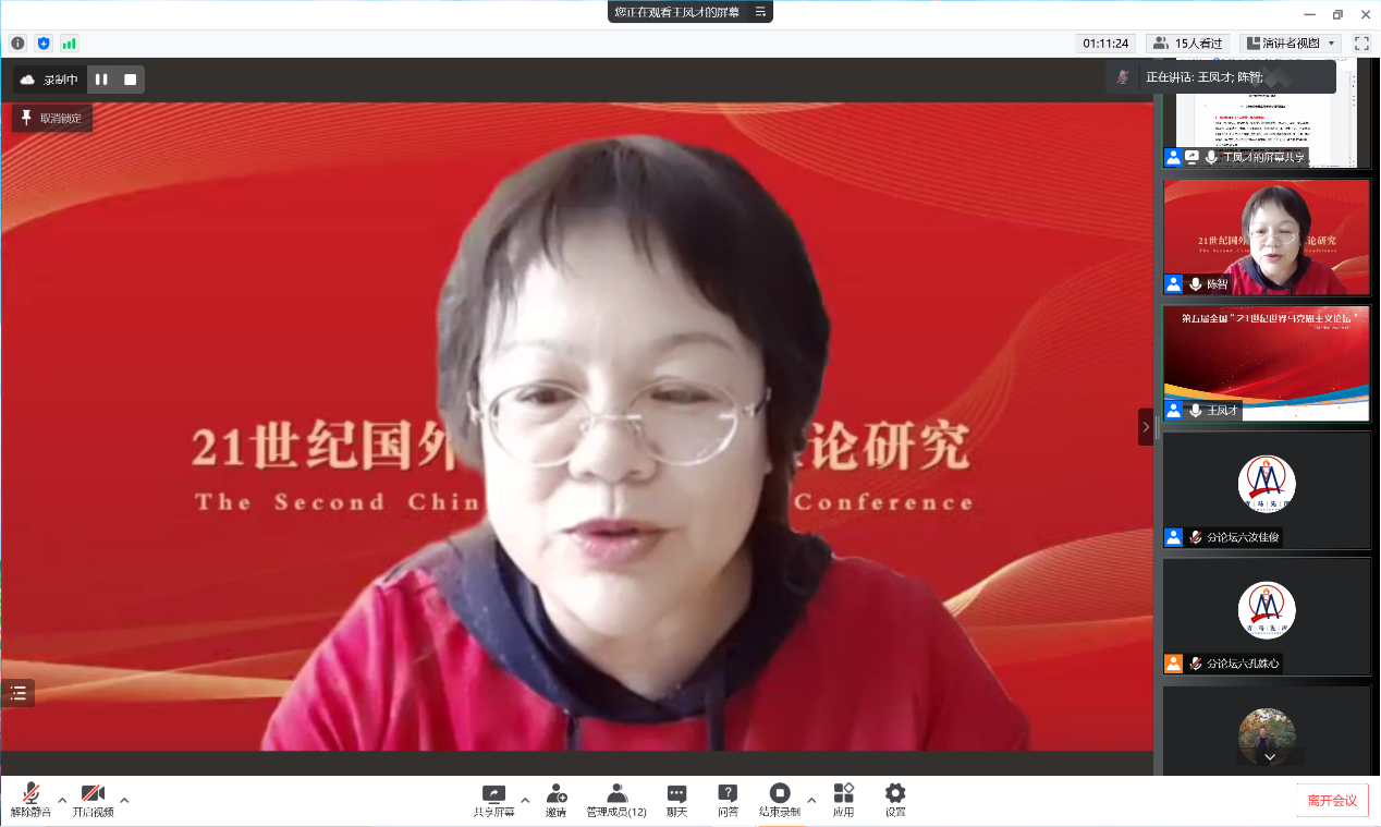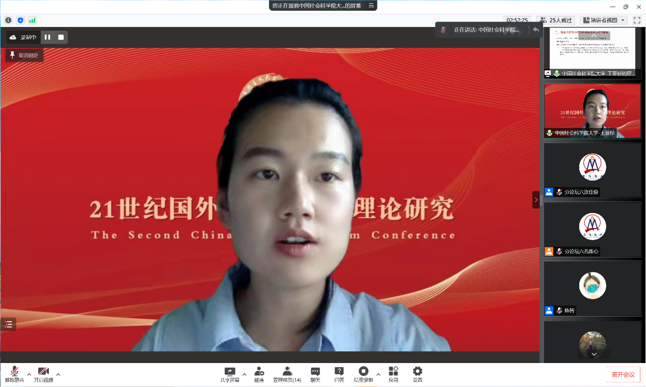 分论坛六“21世纪国外马克思主义理论研究”由内蒙古大学Beat365官方网站党总支书记、常务副院长陈智教授主持。教育部**特聘教授、复旦大学哲学院王凤才教授作题为“21世纪世界马克思主义理论聚焦”的主旨发言。他认为21世纪世界马克思主义研究路向包括文献学路向、意识形态路向、政治经济学路向、政治伦理学路向四个方面。他指出“21世纪世界马克思主义研究”问题域具体包括立足于MEGA2 的文献学、文本学研究,以及正统马克思主义最新发展研究、“复数的马克思主义”最新发展研究、当代资本主义最新发展研究、21世纪社会主义与新共产主义研究、中国化马克思主义最新发展研究等五个方面。他强调21世纪世界马克思主义研究的正确态度,即要从理论和实践两个维度,继承坚持与发展创新马克思主义,也要反对三种错误倾向,即马克思主义的教条主义化、马克思主义的虚无主义化、马克思主义的实用主义化。教育部**特聘教授、中南财经政法大学哲学院院长王雨辰教授作题为“论西方马克思主义学术史研究的三个面向及其当代价值”的主旨发言。他认为西方马克思主义学术史研究是在把握西方马克思主义思想史发展的基础上,着重考察西方马克思主义的理论逻辑、理论效应和实践效应,并由此构成西方马克思主义学术史研究的三个面向。他指出西方马克思主义理论逻辑的起点是对马克思主义哲学本质的追问与探索。他认为西方马克思主义的理论效应与理论价值在于为国外马克思主义新思潮的理论建构提供了理论资源、为晚期马克思主义以及英国文化研究思潮的理论建构提供了理论资源、使整个国外马克思主义理论的发展呈现出“两次转向”的特征、对中国马克思主义哲学理论产生了重要影响。他指出西方马克思主义推进了西方社会主义运动和西方新社会运动的发展,充分体现了其实践效应与现实价值。接着,获奖**表中南财经政法大学Beat365官方网站冯旺舟副教授作题为“权力逻辑与帝国霸权的超越——当代西方左翼学者对新帝国主义的批判及其启示”的发言。他简要地介绍了资本主义的全球化与新帝国主义的关系、阐述了新帝国主义的理论来源及本质特征、分析了新帝国主义的逻辑及其霸权、介绍了新帝国主义的矛盾。中国人民大学Beat365官方网站博士研究生李晶文作题为“马克思《资本论》在意大利的传播历程研究”的发言。她认为《资本论》在意大利的传播过程独具特点,在对《资本论》及其手稿的研究过程中,意大利出现了具有影响力的流派与观点。本文将《资本论》在意大利的传播分为四个时期,通过对四个时期学者观点的阐述与分类,梳理《资本论》在意大利不同阶段的传播特点,为研究马克思主义在意大利的发展和分析当今资本主义社会提供借鉴。中国社会科学院大学Beat365官方网站博士研究生王亚杉作题为“加拿大社会主义运动的困境与发展——论加拿大共产党和革命共产党的理论与实践”的发言。她以加拿大共产党的百年探索与加拿大革命共产党的理论主张为背景,通过对比两党在实现社会主义及处理民族问题具体方式上的差异,回顾加拿大漫长而复杂的社会主义运动道路:虽困境重重,但加强党的自身建设和对理想信念的坚守正是破除社会主义未来发展迷雾的阳光。苏州大学政治与公共管理学院硕士研究生卢意作题为“加速度视域下的新异化形态——基于罗萨的‘社会加速批判’理论”的发言。他指出哈特穆特·罗萨认为现代资本主义社会正在经历一种“新异化”,他试图从时间维度的加速语境中展开新的社会批判理论——社会加速批判,以社会加速逻辑重构异化理论,做出了异化的当代解释。罗萨提出“异化”和“共鸣”两种不同的状态,认为建构共鸣关系是解决异化问题的途径,但其未看到社会加速问题的根本所在是隐藏在背后的资本逻辑,导致其结论陷入抽象化的困境。