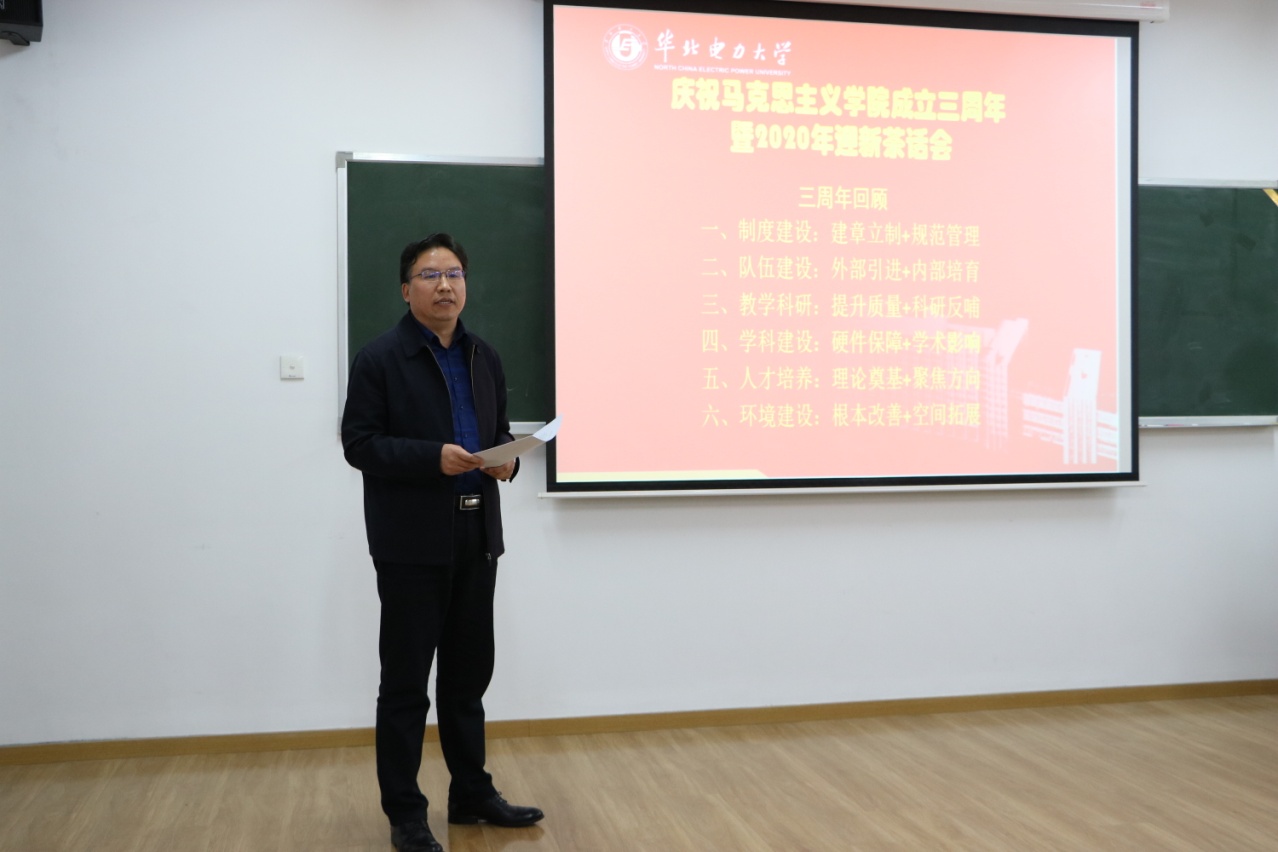 最后,何华代表学校对学院成立三周年表示热烈的祝贺,对老教师们表示衷心的敬意,并对学院未来的发展表示深深祝福,预祝学院在新的一年里更进一步。在对学院工作肯定和鼓励的同时,何华指出,中央对于思政课建设寄以极大的期望和重视,希望学院全体教师要不负中央重托,牢记立德树人使命,讲好思政课,为党和国家培养社会主义建设者和接班人。他强调,当今世界面临百年未有之大变局,世界局势风云变幻,各种不确定性增加,2020年又是全面建成小康社会的决胜之年,对于我们国家的发展具有非常重要的承上启下作用。在历史的关键节点,学生有很多的成长疑惑需要思政课教师拨云见日。为此,他对思政课教师提出四点希望:一、不忘初心,牢记使命,不断加强自身的主动性、积极性;二、重视研究学生受众特点,以学生满意度为导向,不断改革创新教学课程、教学风格、教学方法,不断提升教学质量;三、加强教师自身的人格魅力和品德修为,身教言传合力教育学生,实现显性教育和隐性教育相结合;四、关注国内外大事,加强自身的理论学习,将最新知识融入课堂。他祝愿学院全体教职工在新的一年里齐心协力、以马为梦、以梦为马,为学院的进一步发展做出贡献!