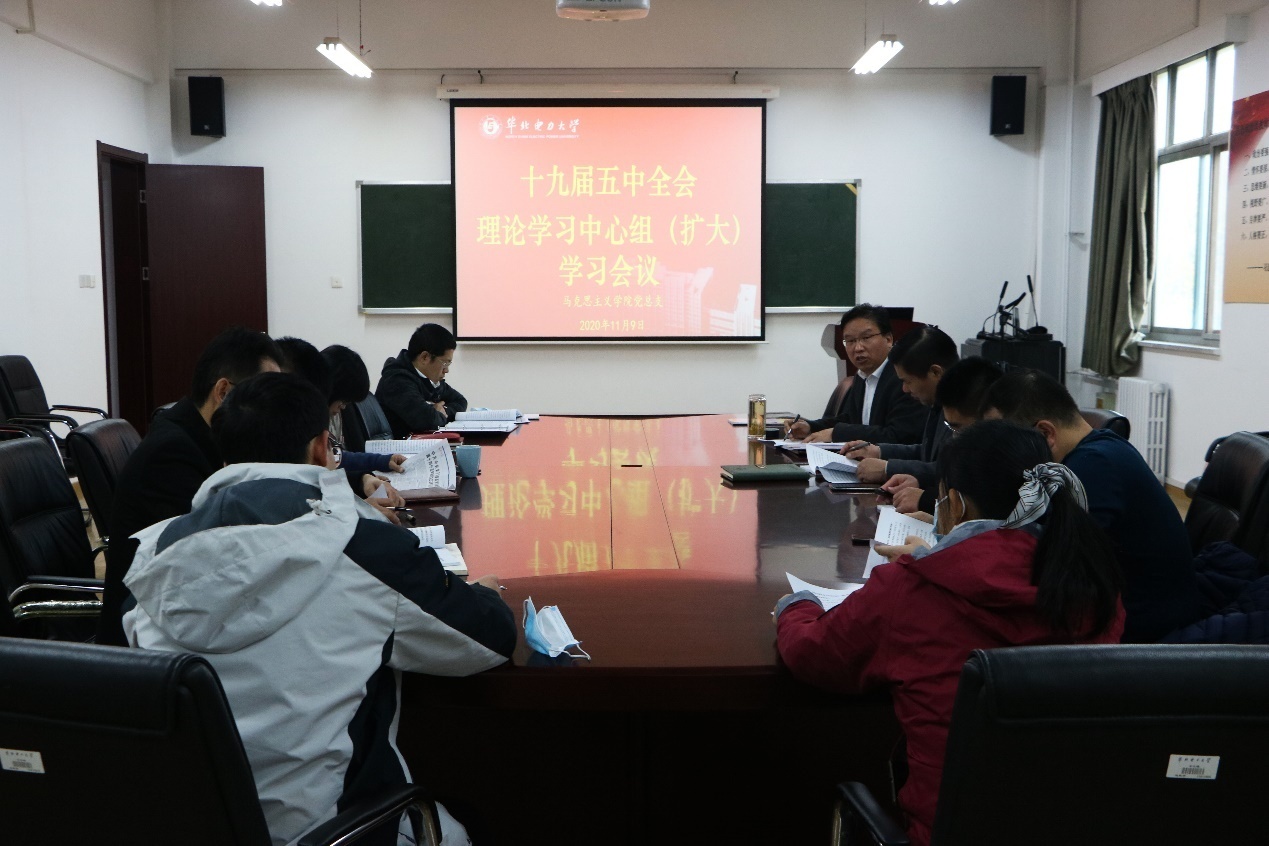 为深入贯彻党的十九届五中全会精神,11月9日上午,Beat365官方网站党总支理论学习中心组在学院会议室召开扩大会议,集中学习学院党总支编印的《中国共产党十九届五中全会学习材料汇编》,重点学习了《中共中央关于“十四五”规划和2035年远景目标的建议(全文)》和《中国共产党第十九届中央委员会第五次会议公报》。学院党总支书记、院长王伟、副院长侯丹娟、教师党支部书记、教研室主任、科研平台负责人以及教学、科研、学科助理参加学习,会议由党总支副书记武昌杰主持。