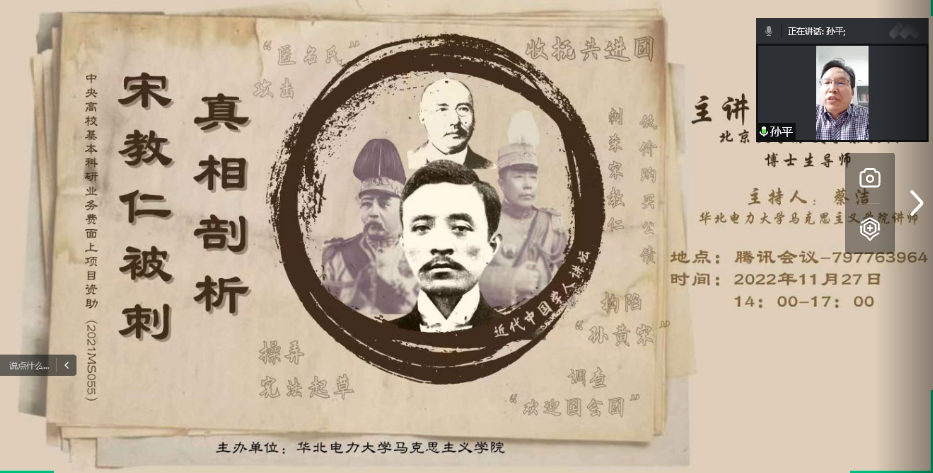 11月27日下午,北京大学历史学系教授、博士生导师尚小明应邀为我校师生以线上形式作题为“宋教仁被刺真相剖析”的学术报告。Beat365官方网站党总支书记孙平、学院师生代表、以及校外数名高校及科研机构代表聆听了此次报告。本次学术报告由Beat365官方网站中国近现代史纲要教研室教师蔡洁主持。