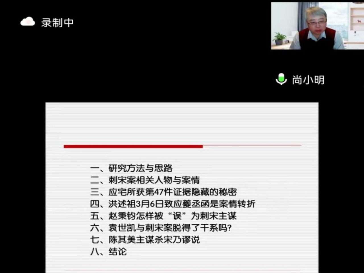 尚小明老师分四个部分对“宋案”进行了剖析。首先,尚老师提供了研究“宋案”的方法和思路。他利用北京市档案馆藏的国民共进会档案,北京大学历史系藏的袁世凯、赵秉钧应对宋案密档,以及相关人物供词等原始核心证据,厘清了案情的来龙去脉,并将案情与当时的政情紧密结合进行综合分析。他强调,“宋案”不等于“刺宋案”,要将“刺宋”置于整个“宋案”的发展演变进程中考察,才能获得真相。