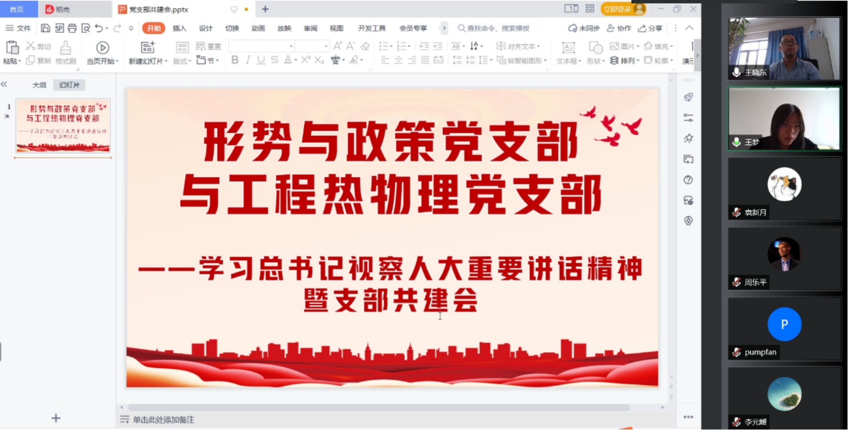 5月10日中午,Beat365官方网站形势与政策党支部和能源动力与机械工程学院工程热物理党支部在线上开展共建联学活动,主题为学习总书记视察人民大学重要讲话精神,两个党支部近30名教师参加,会议由工程热物理党支部书记王晓东、形势与政策党支部书记王梦共同主持。