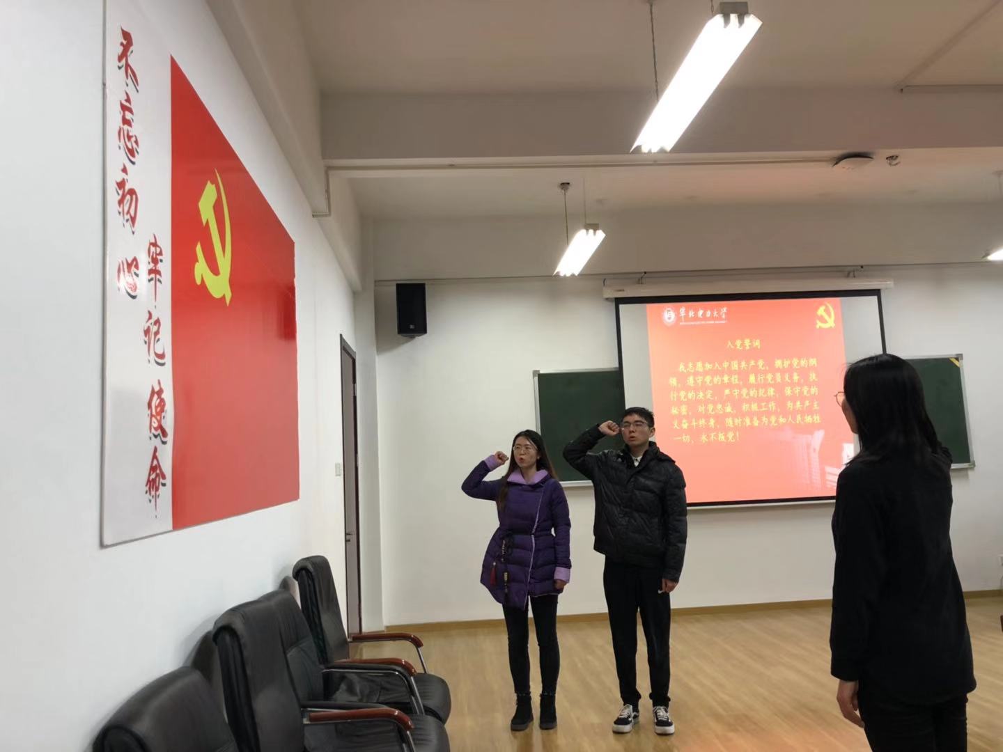 然后,由王天昕带领何心、伍建旭进行入党宣誓。