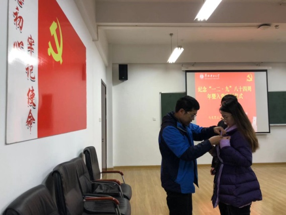 接着,由武昌杰老师为两名新发展的党员同志戴上党徽。