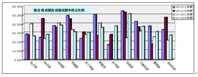 检查中还发现各院系专业课试题结构不断优化,近两年专业课试卷中综合性试题所占比例有所提高(如下图所示)。