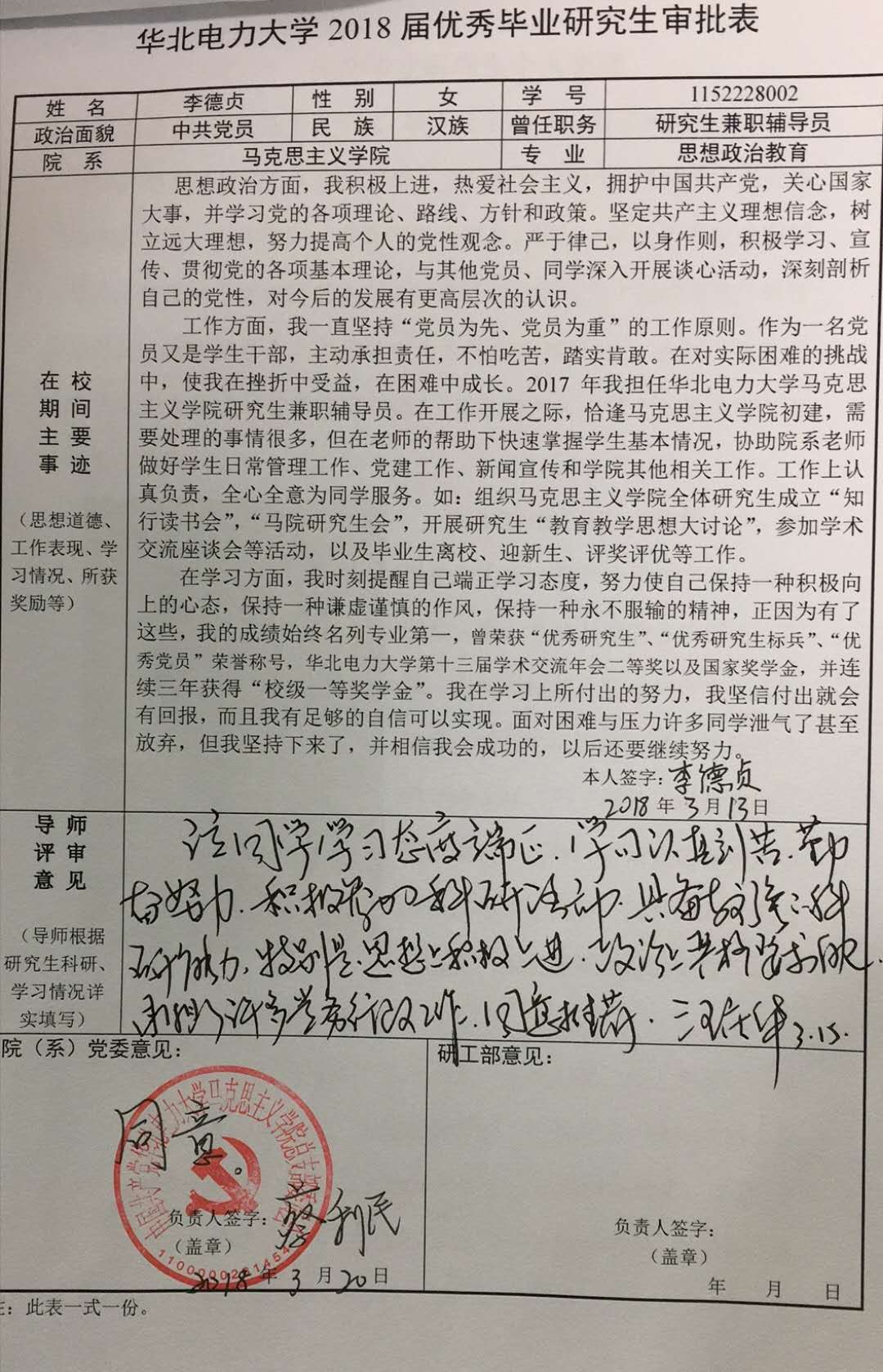 关于推选李德贞为2018届优秀毕业生的公示
